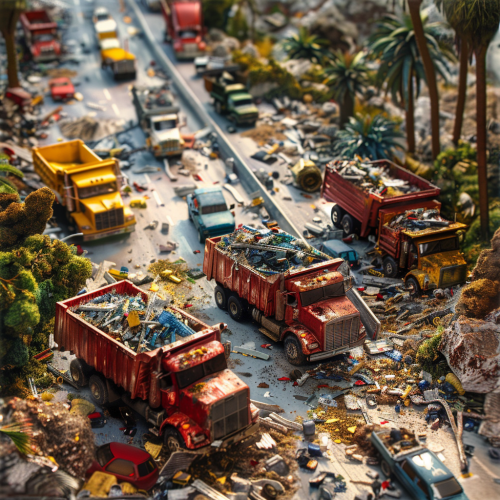 lots of dump trucks, driving down the highway, dumping trash, intricate details. --v 6.0