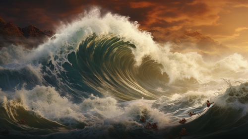 a tsunami wave in ancient times, dramatic, hyperrealistic, photorealistic,32k, --ar 16:9