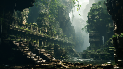 forgotten city, abandoned ancient advanced city in the rainforest, 8k, high resolution, hyper realistic, --ar 16:9