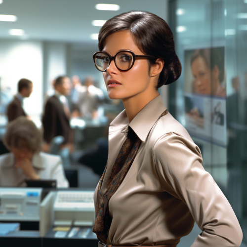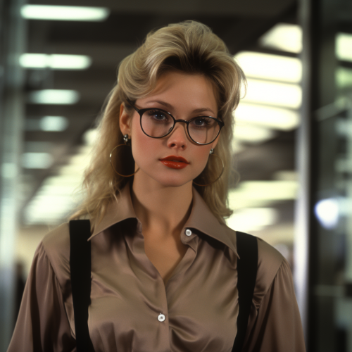 christina applegate as claire kent wearing glasses and her hair in a ponytail walking confidently in the daily planet offices in the 1978 movie realistic