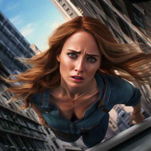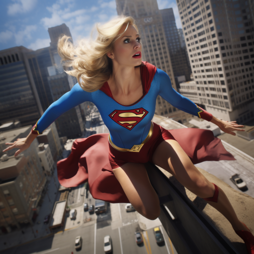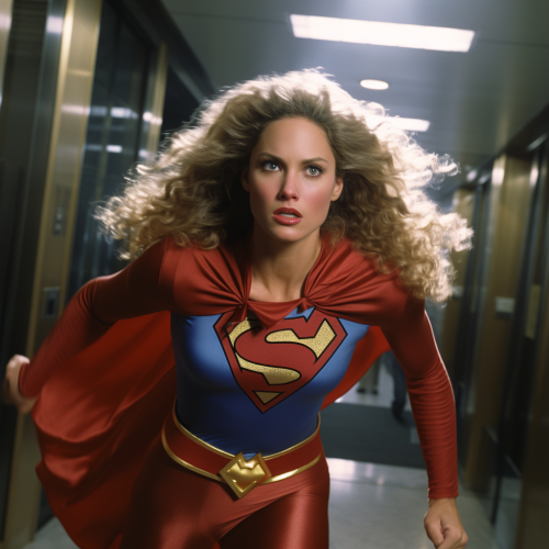 lilan bowden as claire kent running through a building's revolving door at super speed transforming into superwoman in her iconic red and blue uniform in the 1978 movie realistic