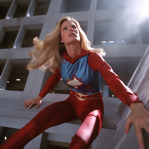 christina applegate as claire kent running through a building's revolving door at super speed transforming into superwoman in her iconic red and blue uniform in the 1978 movie realistic