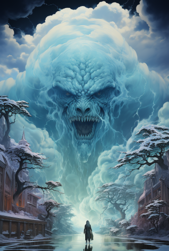 Cloud giant ghost from dungeons and dragons, Fantasy realism, Hyalopterus color palette, Hyper-detailed illustration, Style of Roger Dean, Art Nouveau, Juan Gimeney, Bloomcore, in an ice dungeon, Ink on Parchment --ar 173:256 --s 750 --v 5.2
