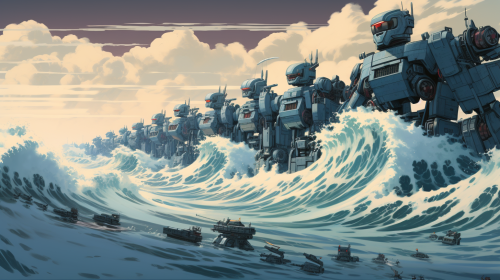 Imagine a giant wave rolling, inspired by Japanese woodcuts , show how the light is reflected on the water, depiction is also inspired by Sisley’s delicate landscapes and Claude Monet’s loose, fast brushstrokes. Use soft blues, greens, and touches of white to create shimmering effects. Show how reflections add depth and atmosphere to the scene, keeping strokes loose and fluid. --ar 4:5 --p teqj53c --s 500