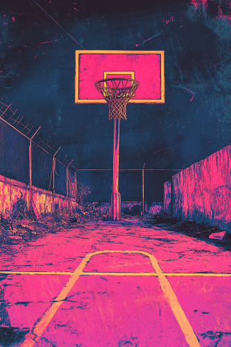 Paradise beach with basketball court, synthwave, doom illustration, t-shirt graphic, centered on a plain background, glow, old, dirty, worn, surreal, block colours, block print style, lino print style --ar 2:3