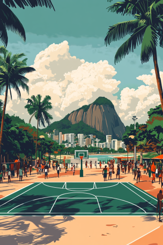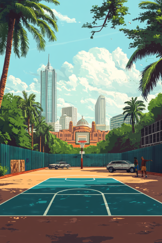 Minimalist realism illustration of a half basketball court in the foreground, featuring an NBA-style hoop with clean lines and no logos or brands. The court is marked with bold green and white accents, clearly inspired by the Nigerian flag. Surrounding the court, a serene yet vibrant scene of Abuja unfolds: locals with diverse skin tones and features are engaged in various activities, some dressed in simple traditional Ankara fabrics and Gele headwraps, others in modern clothing. In the background, Zuma Rock stands tall, its silhouette blending seamlessly with the skyline. Nearby, the natural beauty of Millennium Park introduces lush greenery and open space, contrasting with the distant, modern high-rise buildings. The overall design is clean and uncluttered, with palm trees and a few scattered market stalls bringing subtle hints of local life. The basketball court remains the focal point, surrounded by an understated yet distinct sense of Nigerian culture and landscape --ar 2:3 --s 250 --v 6.1