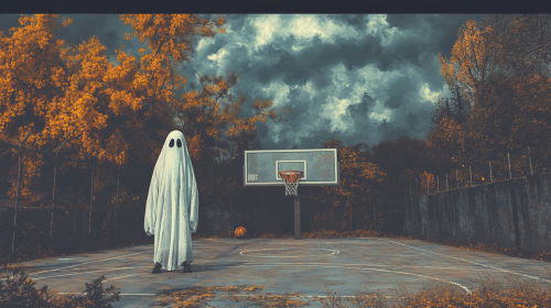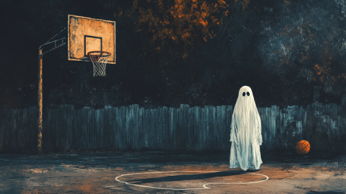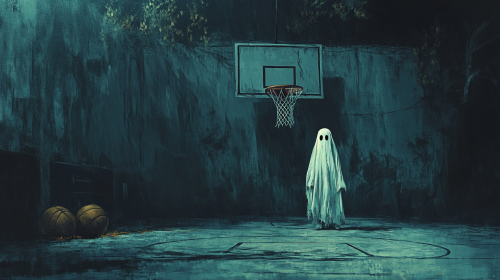 painting style, textured. spooky feeling. dark and dull colouring. basketball court. white halloween ghost standing in basketball court. spooky --ar 16:9