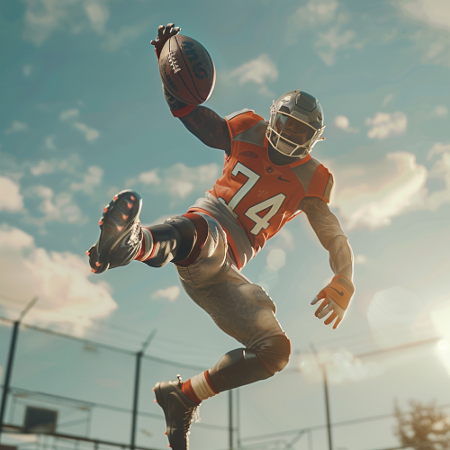 american football player in full gear leaping in the air to dunk a basketball shot in a college court field, 4k, hyperrealistic