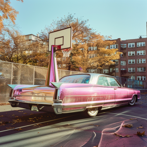 Create an image of a classic sedan car with a shiny pink and white two-tone paint job. The car is balancing on its rear bumper and tail, positioned vertically and aligned with a basketball hoop in an outdoor basketball court. The court is enclosed by a chain-link fence and there are apartment buildings visible in the background under a clear blue sky. The car's chrome details gleam in the sunlight, and the white-walled tires are pristine and new. A few autumn leaves are scattered on the ground of the court, and the basketball hoop stands old and slightly rusted. The image captures the surreal scene during golden hour, with long shadows stretching across the court, enhancing the verticality of the car in this unexpected urban tableau.