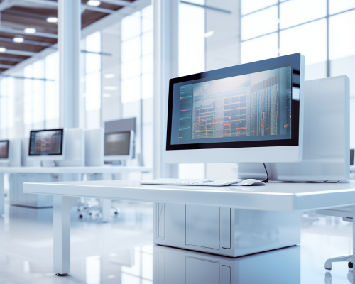 high gloss desk with an blank computer iMac monitor, in a bright white space, sitting in server room with servers in the background, the focus is on the monitor, with a large aperture in order to faintly see the background --ar 5:4