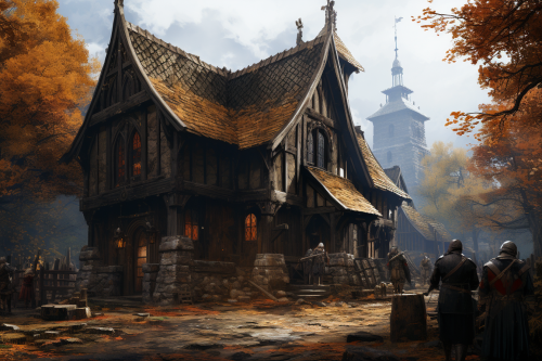 a medieval wooden church with a crowd of people standing outside, fantasy setting, speedpaint style, impressionist oil art, gritty brushes, style of Martin Grip, style of Richard Anderson, style of Symbaroum, --ar 3:2 --s 250