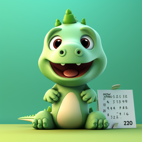 Clay animation, cute green child dinosaur (Tyrannosaurus) with big eyes, hail cute green child dinosaur, clay animation, smiling with mouth slightly open and looking up, light turquoise background, January calendar on wall, --v 5.2