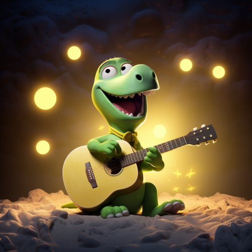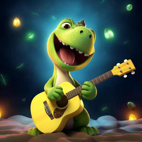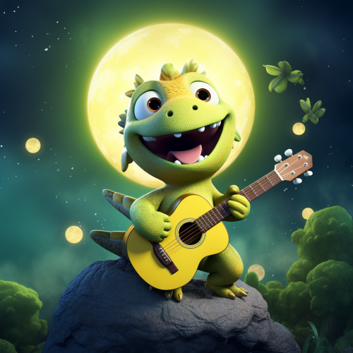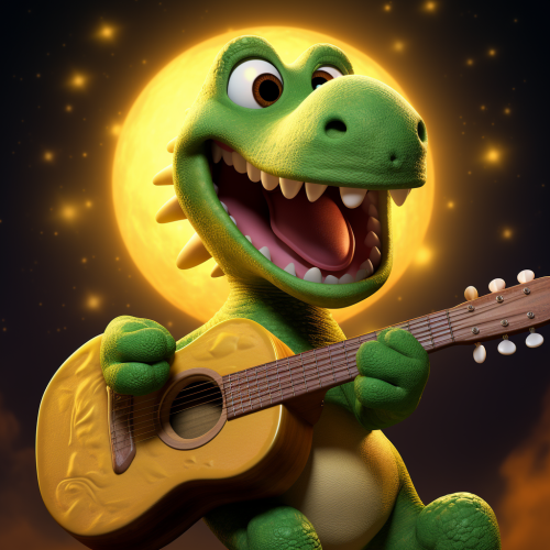Clay animation, full moon with yellow glow🌕, green dinosaur (tyrannosaurus) child with big eyes, cute green child dinosaur, clay animation, smiling with mouth slightly open, full moon background🌕, yellow guitar, --v 5.2