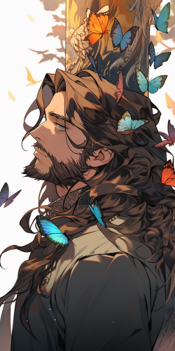 attractive man with long hair and beard emerging from an insect cocoon --niji 5 --ar 1:2