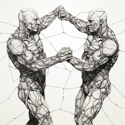 heavy metal album cover hand drawn style Conjoined bodies, one trying to push its way from another. It's the self trying to escape his own self. Pushing the depression, anxiety, fears away.