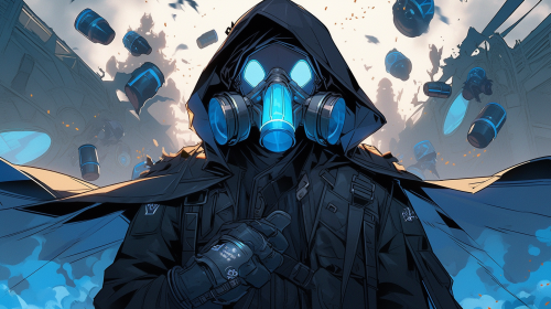 Hand-drawn, a male being within a suit of hazmat armor and a gas mask that has the abilities of earth manipulation, the goggles of the hazmat mask radiate with a azure blue glow as a blue steam puffs out the mouth holes of the gas mask, the h armor is adorned with a long flowing black cape, the being conjuring forth rock structures toward the camera, standing on top of a large mountain within a dynamic pose glaring toward the camera menacingly, mountain background with other rock structures, the color of the suit is black, full-body capture fullying displaying the armor and power, geo-kinesis meteors and rocks hurling downward as the being runs opposite away from the camera, cinematic lighting, cinematic scene, running, fighting, --niji 5 --style scenic --ar 16:9