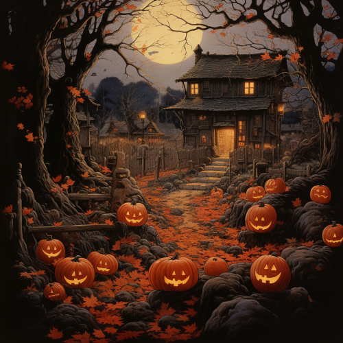 1980s seinen anime by Yoshiyuki Sadamoto, landscape, halloween, haunted house, ghosts, jack-o-laterns, autumn, twilight, fallen leaves, spooky, macabre,