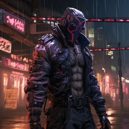 full body Seinen anime art style of DC comics Cyberpunk Bane, cell shading, natural lighting, natural shading, dynamic action pose, at the black market in a futuristic Gotham City, depth of field, style 1000, v 6.0, 28:10