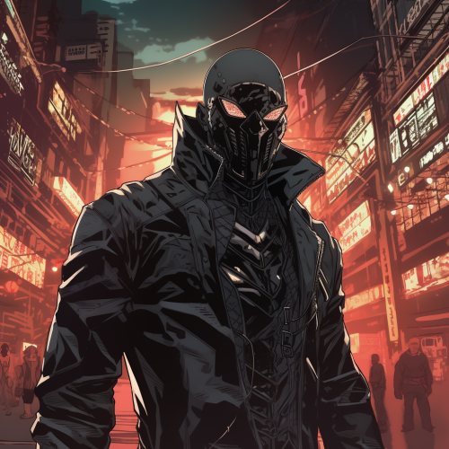 DC comic’s cyberpunk Black Mask, in a Seinen anime art style, dynamic pose, cell shading, black outlines, natural lighting, natural shading, at the black market in a futuristic Gotham City, depth of field, style 550, v 6.0, 28:10