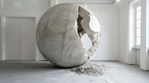 a huge concrete sphere broken and sqweezed in a door entarance, large minimal and clean studio, the sphere is larger than the door, --ar 16:9 --style raw --v 6.0