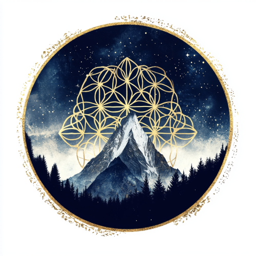 Create a logo for Sacred Mountain Rituals, featuring a fusion of the Flower of Life and psycho-geometric spirals in a balanced, symmetrical design. The logo should be minimalistic yet powerful, with intricate gold detailing on an indigo and white background, and subtle hints of aurora borealis colors to evoke a sense of mysticism and spiritual depth. The overall aesthetic should feel both modern and sacred.