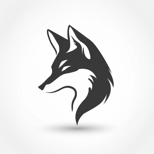 black icon of fox head looking to the left, white background, flat, minimal, no shadow