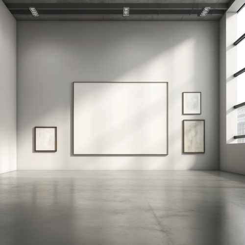 art gallery wall with white floor and grey wall color, one large side window, no shadows, no details, minimalistic