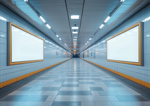highg quality real photo. clean and cozy is underground station with big empty framed board for adds on the wall. board is white color --ar 7:5 --s 750