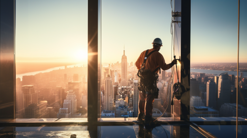 a building cleaner hanging on a window, cleaning the window with a window squeegee, seen from inside, high building, in Background New York Central Park, the sun is rising, ultra details, --ar 16:9