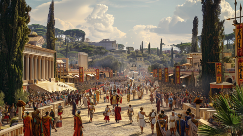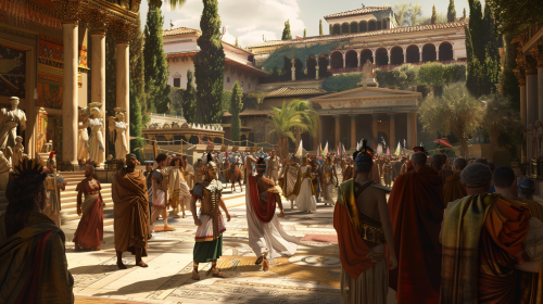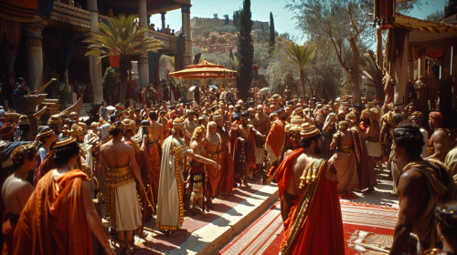 overview of incredible and epic shot of an egyptian entourage with cleopatra in her 30's and her roman son caesarion visiting julius caesar in rome, show a large entourage of egyptians at a first century bc roman villa of high status, be creative and show intricate details, Nikon D850, Fujifilm Velvia 50 color film, Nikkor 24-70mm lens, low-angle shot, wide aperture to capture the breadth of the scene, slow shutter speed to blur motion and add intensity, Stanley Kubrick, Christopher Nolan, Annie Leibovitz, Vivienne Westwood --ar 16:9 --v 6.0
