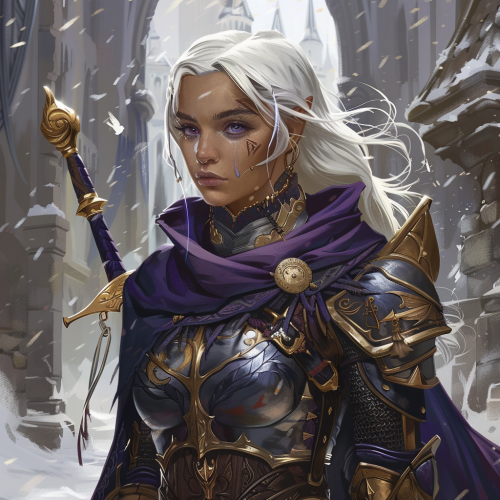 Medieval Fantasy, D&D Fantasy Style, white haired elven woman, purple eyes, astral background, Cleric, battle-worn Mithril armor, Golden Lance