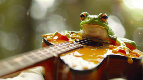 Portrait of little greean frog sleaping on a rock in a greean pond, the sun is shining, distorted realism, use all bright colors, full HD 24K, sharp on details --ar 16:9 --niji 5 --s 250