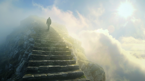 photoreaalistc ascending traight line of steep,empty endless stone stairs, going nowhere. The steps climb directly upwards through a foggy mountain landscape, with the peaks barely visible in the distance. Warm sunlight catches on the edges of the steps, hyper-detailed textures, hd quality --ar 9:16 --v 6.1