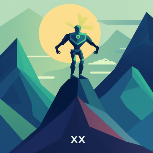 0xBot logo depicting a robot lifting a human figure towards a mountain peak, representing achievement and support, the '0x' symbol subtly included in the background, dynamic composition with bold colors, illustration, inspirational artwork, --ar 1:1 --v 5.0