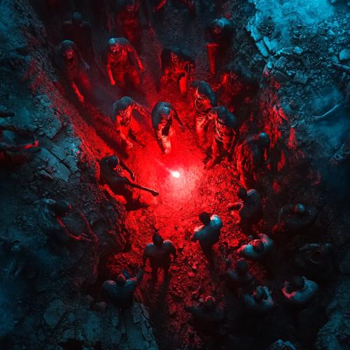many zombies are climbing the earth walls of the narrow pit in the ground, screaming in rage lightened by the red light torch, seen from above, high density packed action, color red and blue