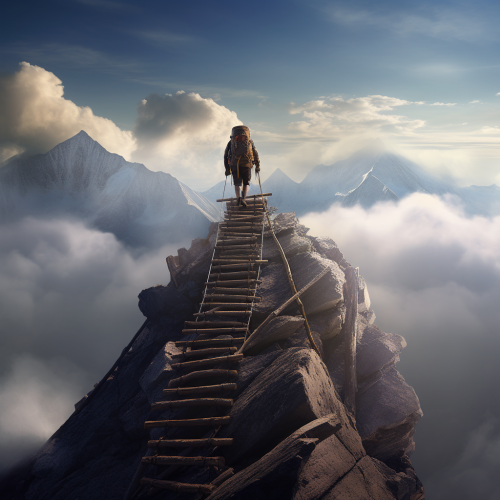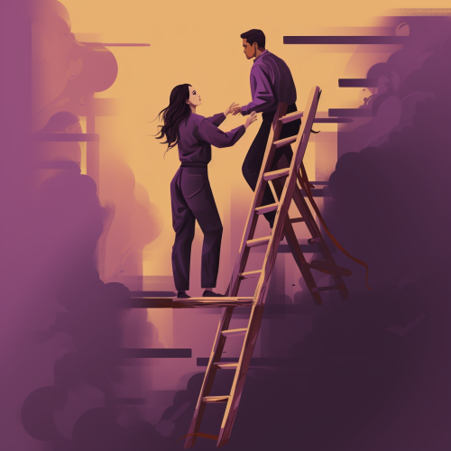 gender inequality, a man trying to climb a ladder with many rungs, a woman trying to climb a ladder with few rungs, casual clothes, violet and dark gold palette, neutral background v 6.0
