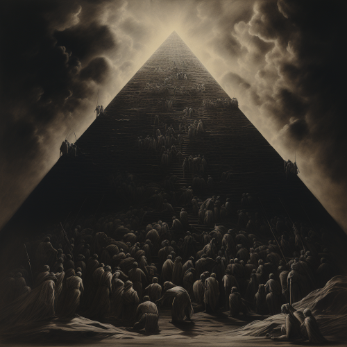 illustration entitled "the great darkening" showing a massive pyramid and poor people trying to climb it