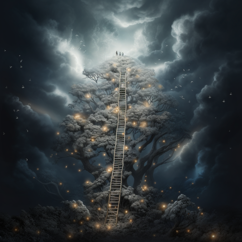 A huge ladder stands on an empty space between bushes, and rises to the sky without leaning on anything, everything is dark and only the ladder is lit, white figures with large wings climb the ladder