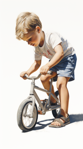 a kid trying to climb the tricycle, outdoor sunlight, hyperrealistic, realistic, white background, --ar 9:16