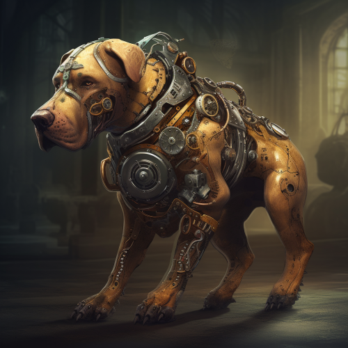 in frank frazetta's style : In the realm of fantastical steampunk, a clockwork hunter stalks the cogs and gears of a sprawling city, their mechanical limbs allowing for agile movement and precision. With a monocle affixed over a glowing ocular implant, this relentless tracker stands ready, a blend of advanced technology and keen survival instincts, poised to capture or eliminate their quarry amidst the intricate clockwork landscapes.