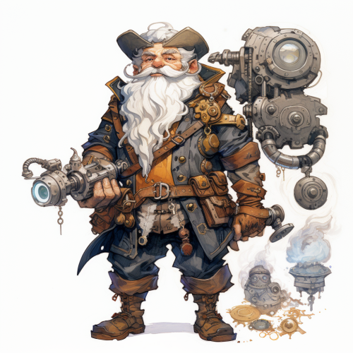 A character design sketch of a male gnome artificer with a clockwork blunderbuss made of spare parts, wearing ramshackle clockwork armor, silly, friendly, fantasy character art, white background. Drawn by takesha obata