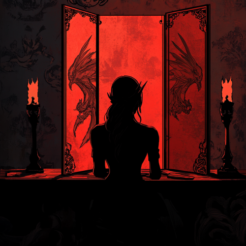 dungeons nad dragons, fantasy, illustration, comicbook artstyle, silhouette of a female sitting behind a red divider, candels, high class room, expesive atmosphere