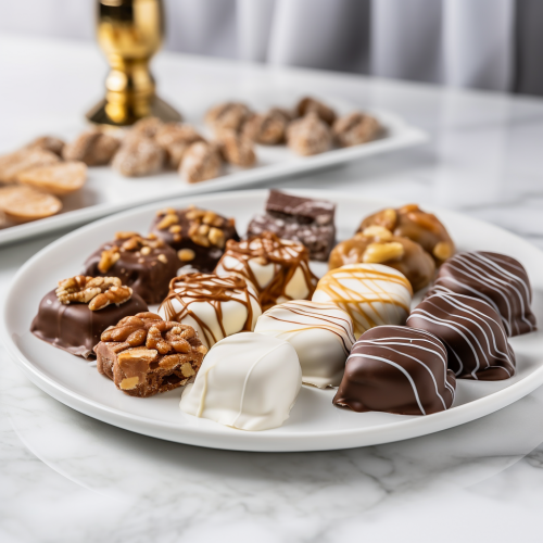 american pralines on white plate, white marble table v5 ar 2:3 --v 5.2 --style raw