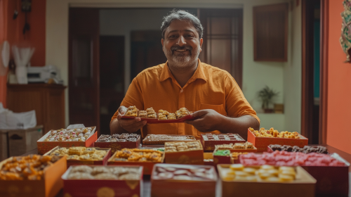 Create a warm and inviting image of a father in his30s sitting at a dining table. The table is adorned with multiple open sweet boxes filled with traditional Indian sweets. The father is holding a piece of kaju katli in his hand, smiling as he enjoys the festive atmosphere --ar 16:9 --v 6.1