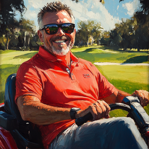 a heroic image of a handsome smiling dad on a riding lawn mower wearing fancy athletic sunglasses and a bright red shirt, beautiful golf course in the background, sunny, high realism, vivid colour