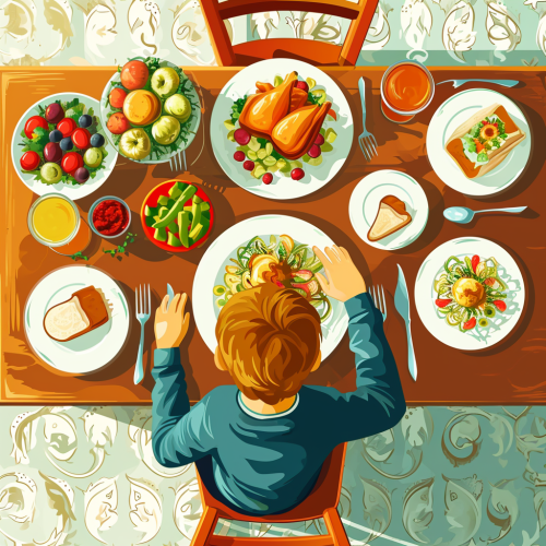 a boy at the dining table , birdseye view, vector art --v 6.0 --style raw
