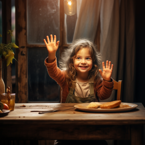 A 5-year-old girl is sitting at the dining table and waving her legs