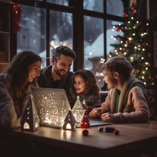 a happy family sitting at the dining table looking at their laptop, Christmas decorations around the room, fireplace lit and snow through the window, with a subtle green light reflecting on their faces and throughout the room