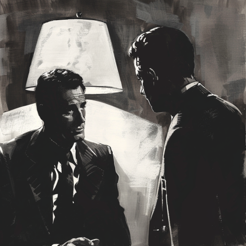 man interrogating other man, office, face black shadow, noir, weird fiction cover art