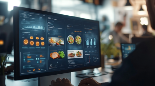 A sleek digital platform interface, with intuitive meal selections based on genetic test results. The screen displays customized meal options with healthy food images, fitness and wellness data, and an option to chat with a nutritionist. In the background, an office environment with employees accessing the platform on their devices, while some are engaging in conversations about their meal plans. Modern, tech-driven atmosphere, photorealistic UI design, hd quality --ar 16:9 --v 6.1